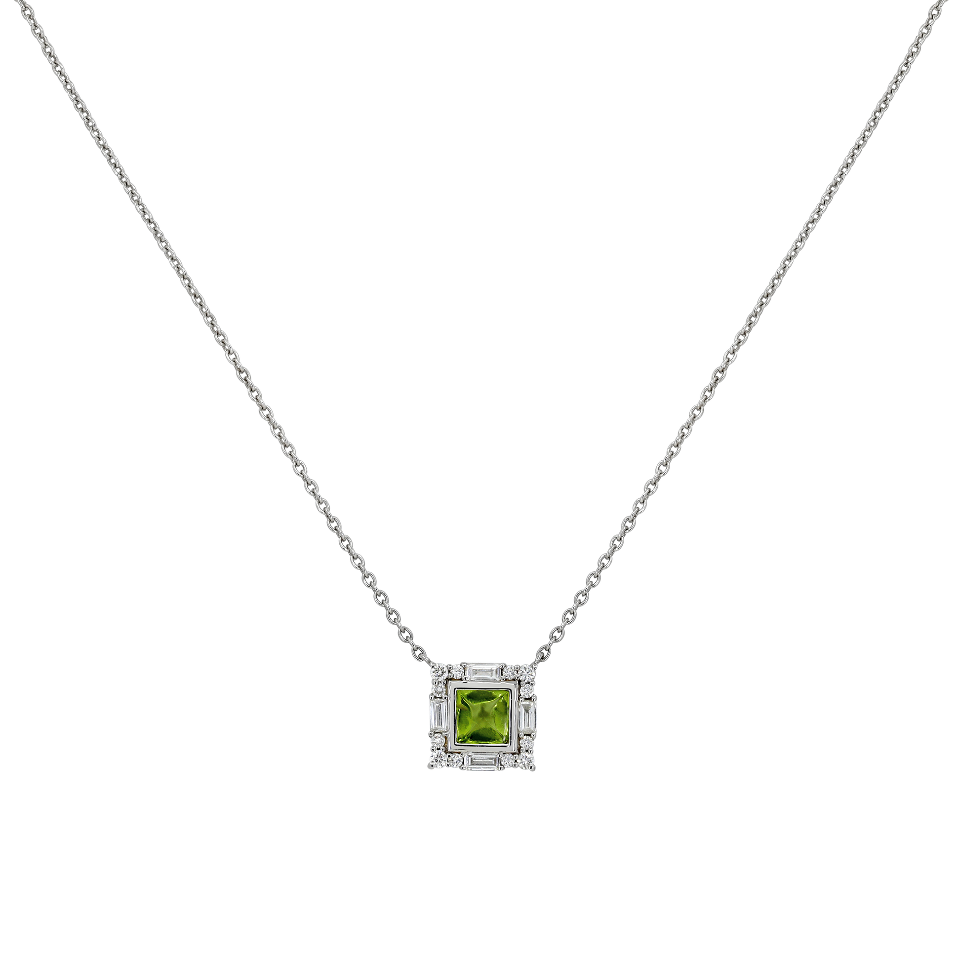 Encircling this mesmerizing gemstone is a harmonious blend of natural baguette-cut and round brilliant diamonds, creating a dazzling frame that enhances the peridot’s vivid color with a refined sparkle. The contrast between the sleek, elongated baguettes and the brilliance of round diamonds adds dimension and elegance, making this necklace a true statement of sophistication.